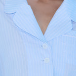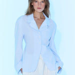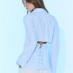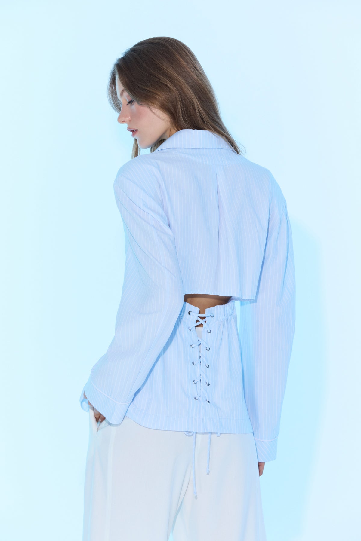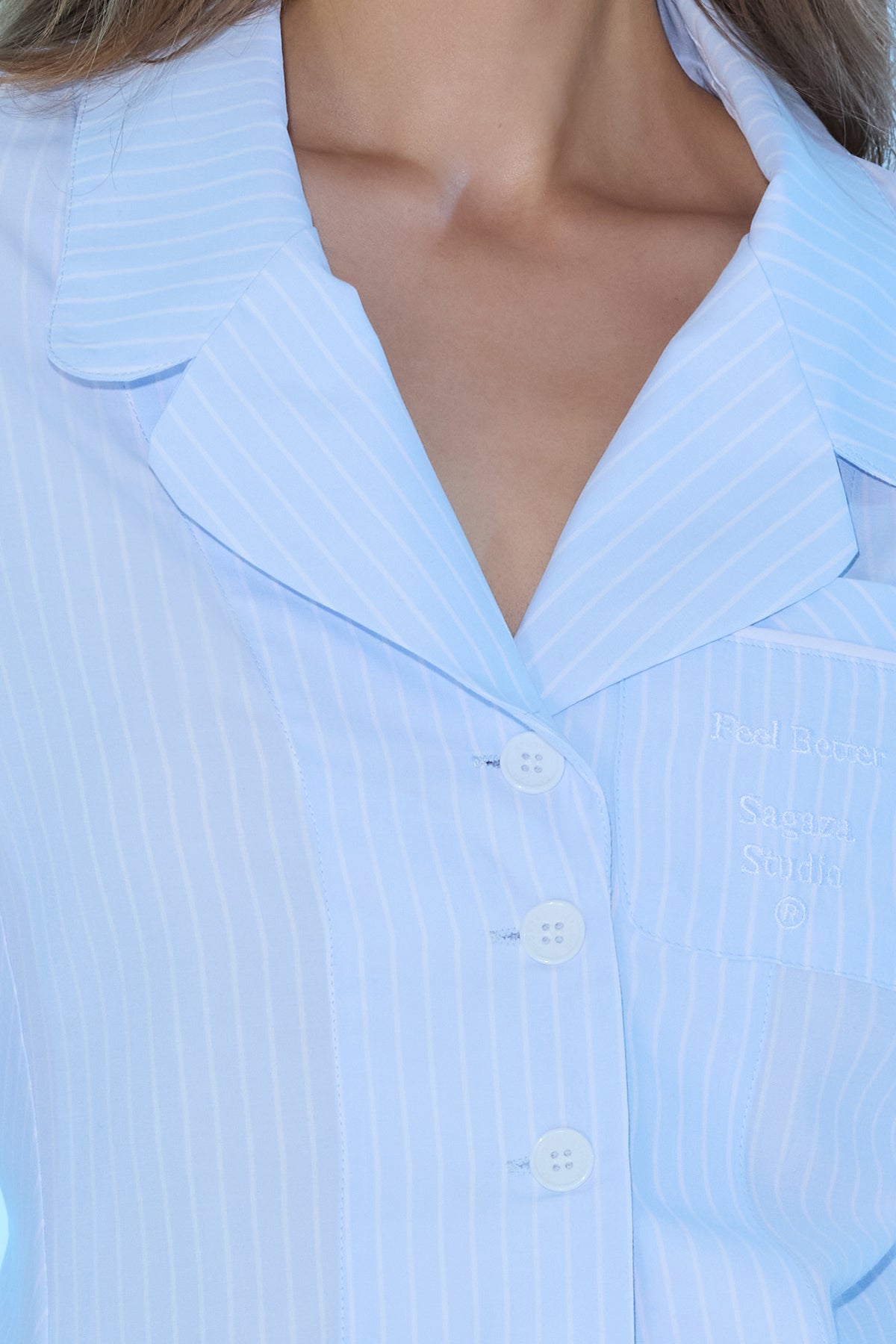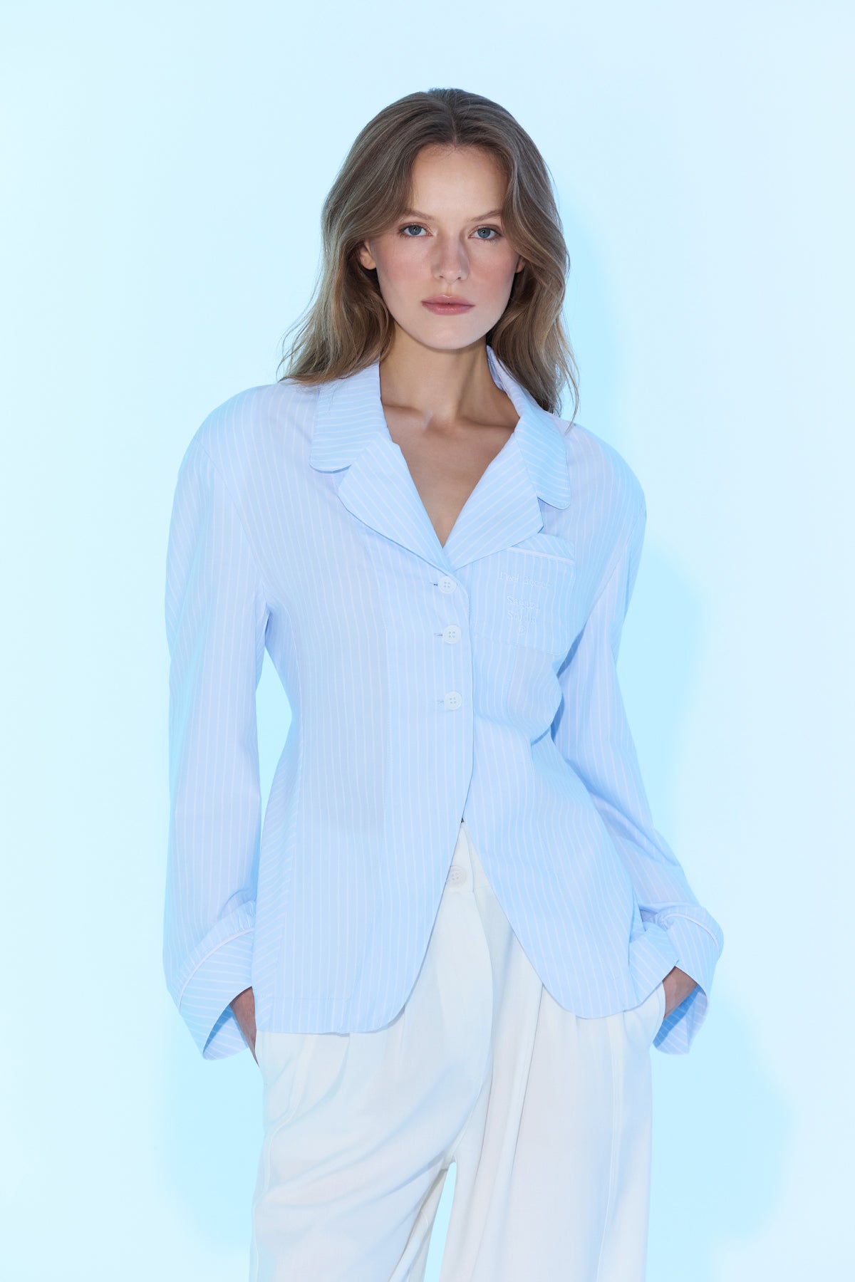 AÇIK MAVİ BEYAZ ÇİZGİLİ, VATKALI, ARKASI LASTİK VE KUŞGÖZÜ İP DETAYLI, SAGAZA NAKIŞ İŞLEMELİ UZUN KOLLU CEKET MODEL BOYU:1.78 CM MODEL BEDENİ: 34 MODELİN ÖLÇÜLERİ: GÖĞÜS:92 CM BEL: 60 CM BASEN:91 CM DİR.; OMUZDAN BOY: 70 CM GÖGÜS:43 CM %50 PAMUK % 50POLYESTER