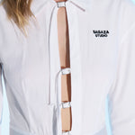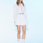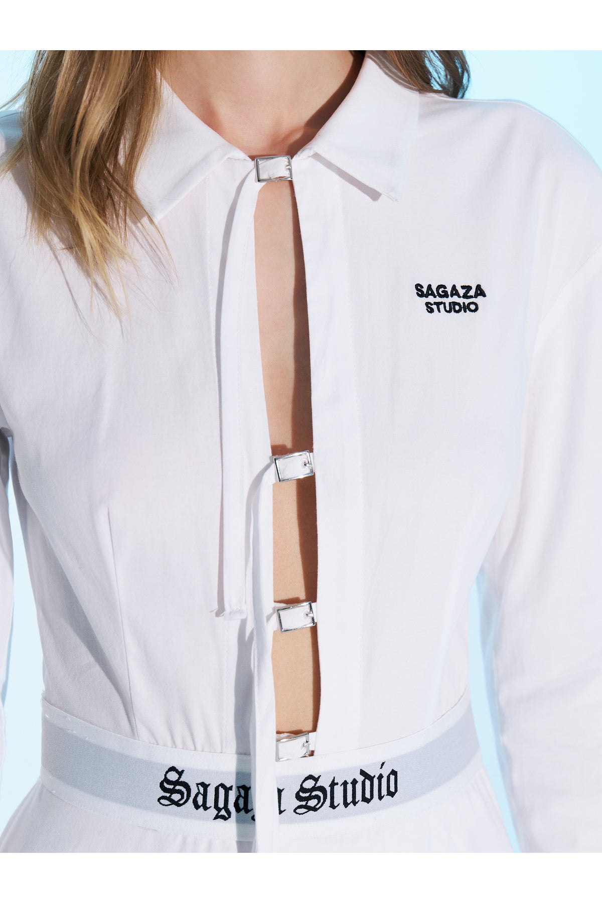 Ekru, önden metal aksesuar detaylı, SAGAZA logo lastik kemerli, uzun kollu gömlek mini elbise.; MODEL BOYU: 1.78 CM MODEL BEDENİ : 34 MODELİN BELİ : 60 CM BASENİ :91 CM DİR .; %50 PAMUK %50 POLYESTER
