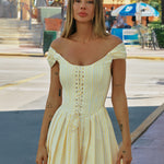 Önden kuşgözü ip detaylı, korsaj görünümlü, düşük omuz mini elbise.; MODEL BOYU: 1.78 CM MODEL BEDENİ : 34 MODELİN BELİ : 60 CM BASENİ :91 CM DİR .; %97 PAMUK % 3 ELASTAN