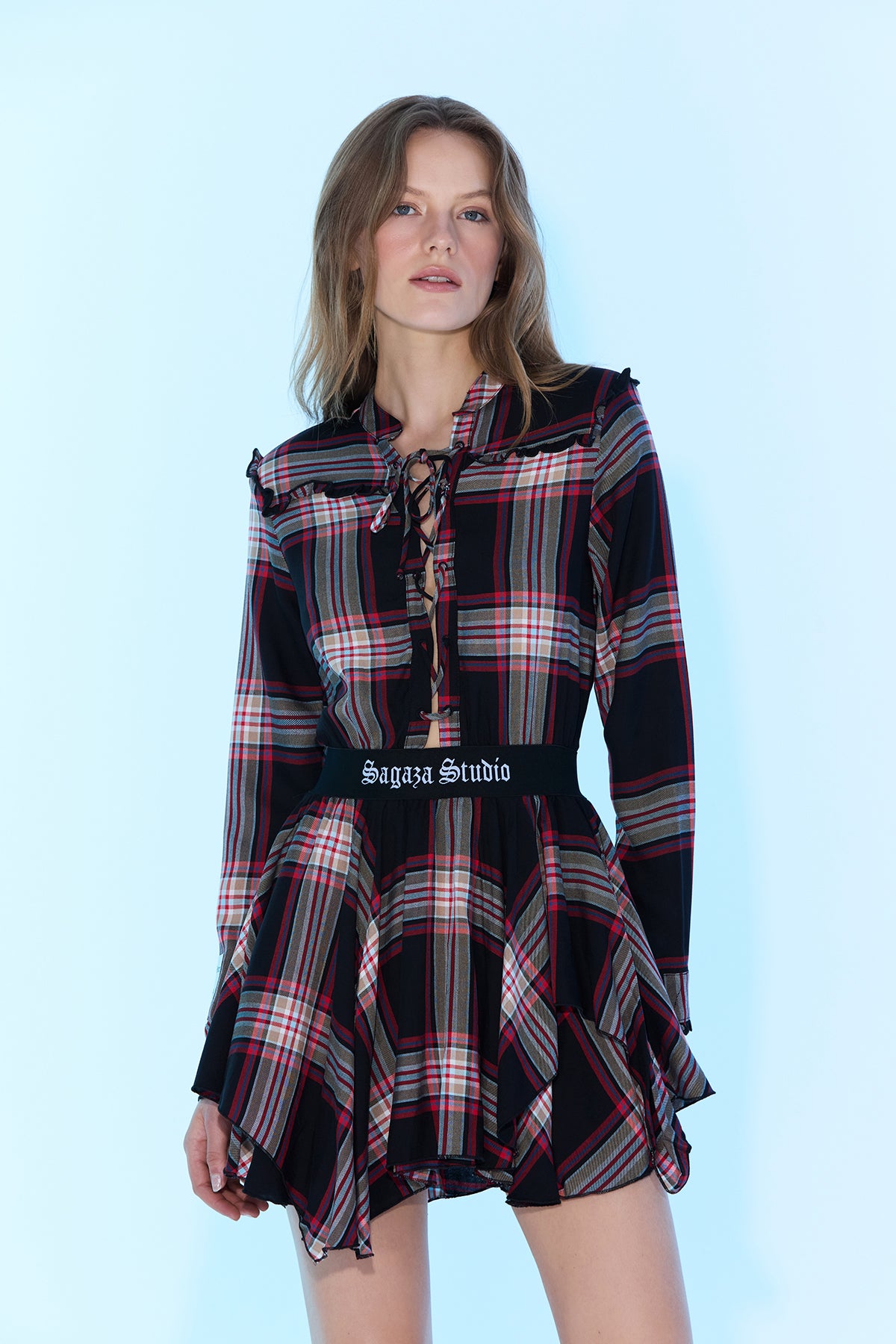 SAGAZA LOGO LASTİK DETAYLI, EKOSE DESENLİ , UZUN KOLLU MİNİ ELBİSE.; MODEL BOYU:1.78 CM MODEL BEDENİ: 34 MODELİN ÖLÇÜLERİ: GÖĞÜS:92 CM BEL: 60 CM BASEN:91 CM DİR.; OMUZDAN BOY: 75 CM GÖGÜS:31 CM BEL:27CM BASEN:53 CM %100 VİSCON