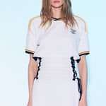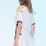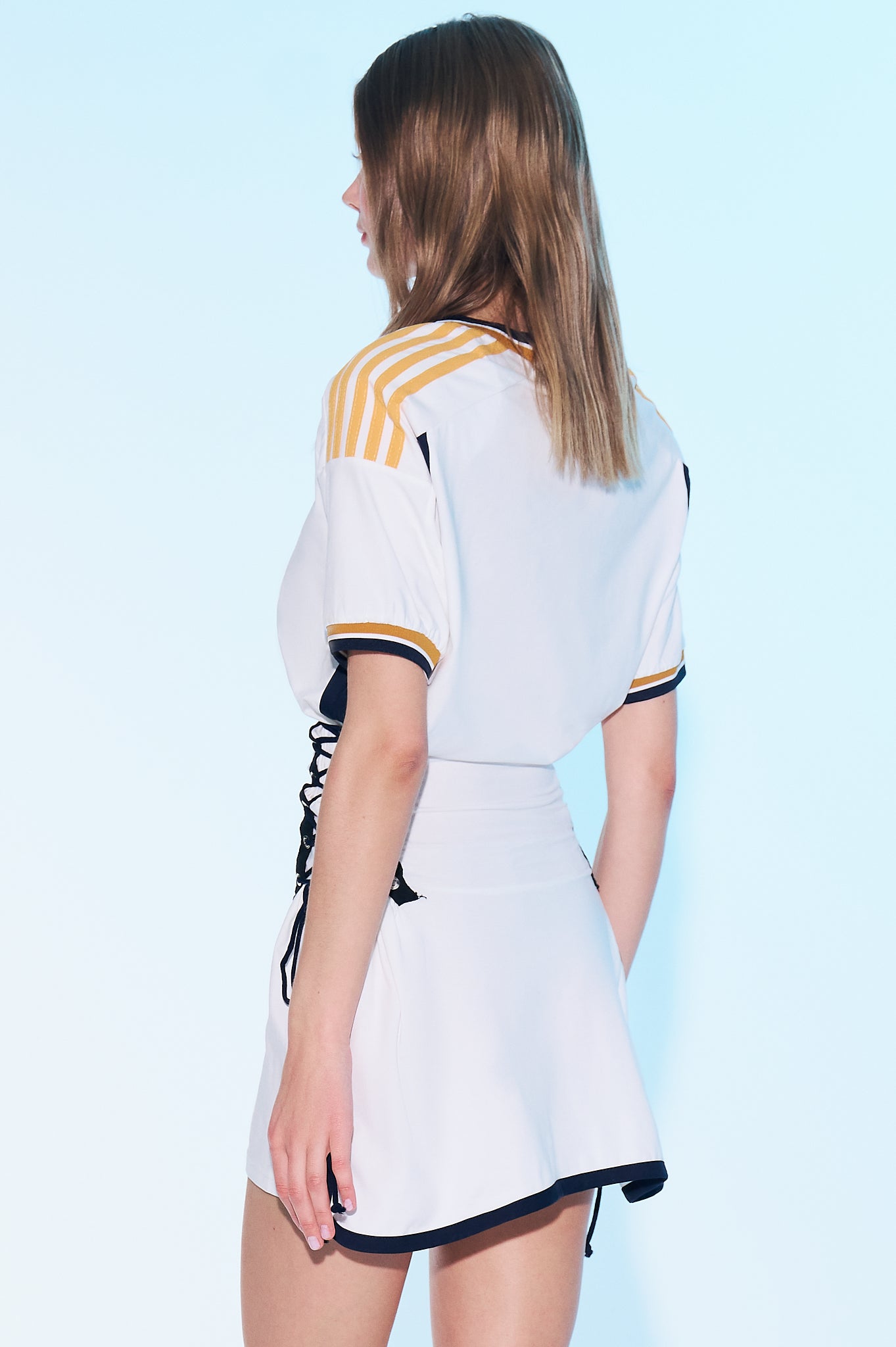 SAGAZA NAKIŞ DETAYLI, YANLARI KUŞGÖZÜ İP DETAYLI, KONTRAST ŞERİTLİ, KISA KOLLU MİNİ ELBİSE.; MODEL BOYU:1.78 CM MODEL BEDENİ: 34 MODELİN ÖLÇÜLERİ: GÖĞÜS:92 CM BEL: 60 CM BASEN:91 CM DİR.; OMUZDAN BOY:87 CM GÖGÜS:50 CM ETEK UCU:64 CM %96 PAMUK %4 ELASTAN
