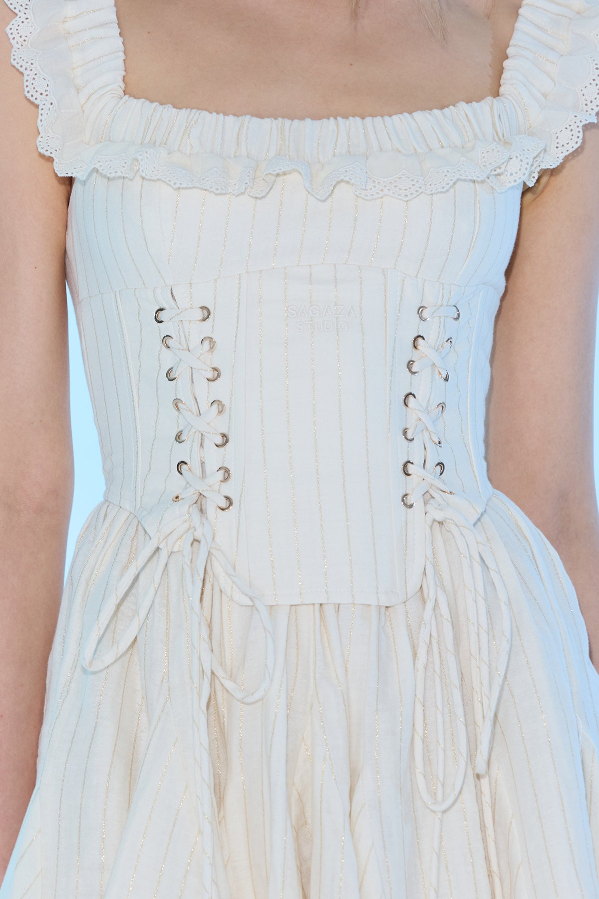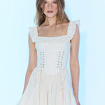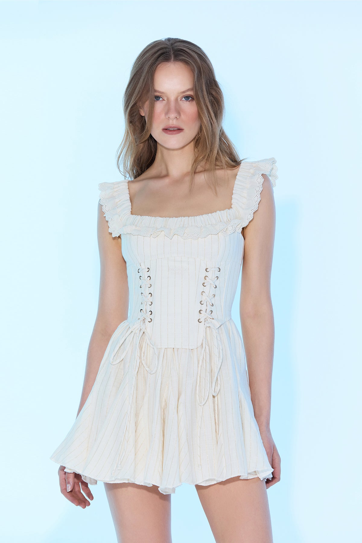 DÜŞÜK OMUZ, KORSAJ VE KUŞGÖZÜ İP DETAYLI, MENDİL ETEKLİ MİNİ ELBİSE.; MODEL BOYU:1.78 CM MODEL BEDENİ: 34; MODELİN ÖLÇÜLERİ: GÖĞÜS:92 CM BEL: 60 CM BASEN:91 CM DİR.; ÖN BOY: 64 CM GÖGÜS:41 CM BEL:34 CM %98 KOTON %1 METALİZE %1 POLYAMİT