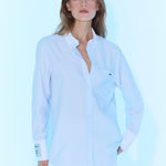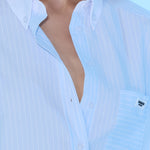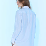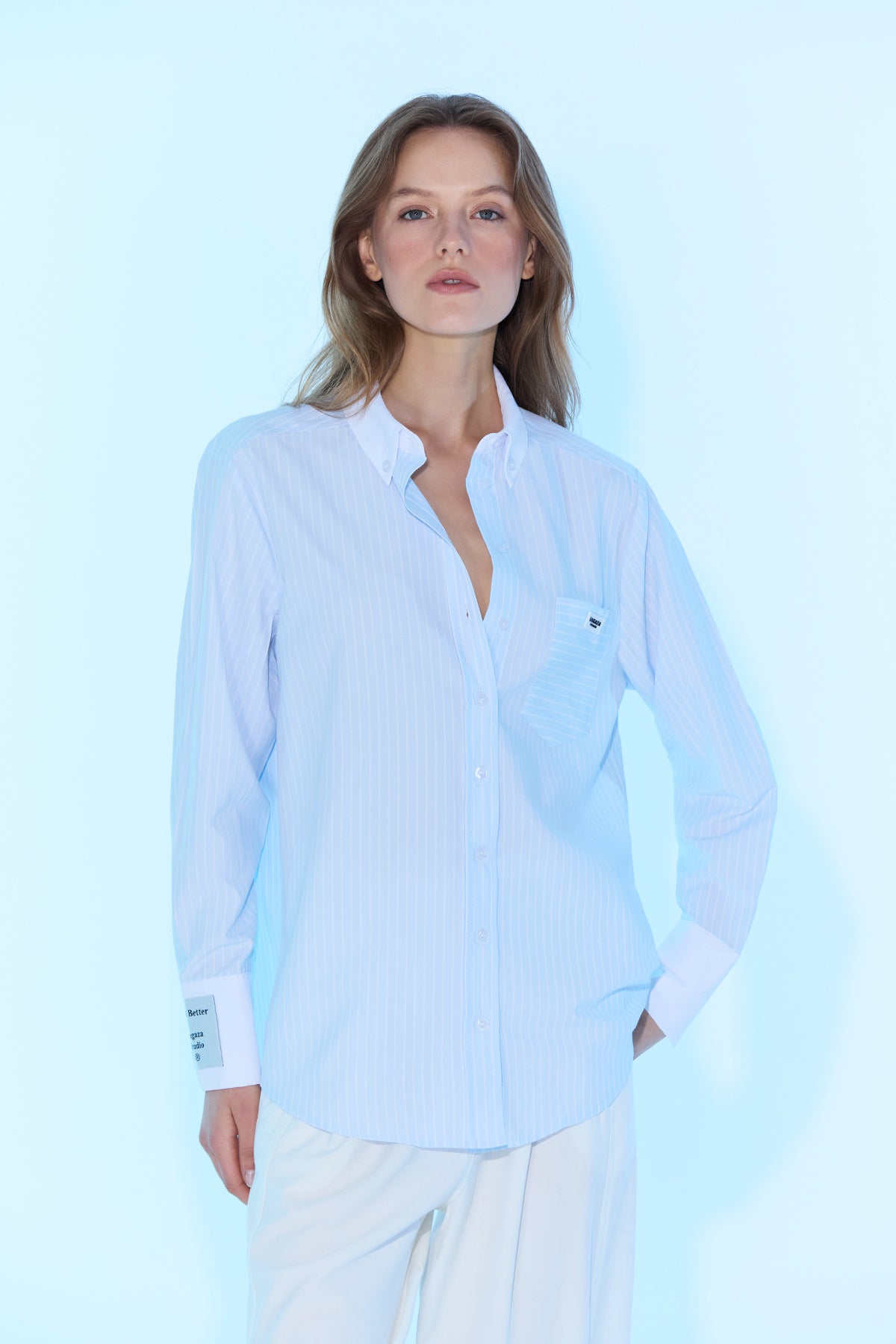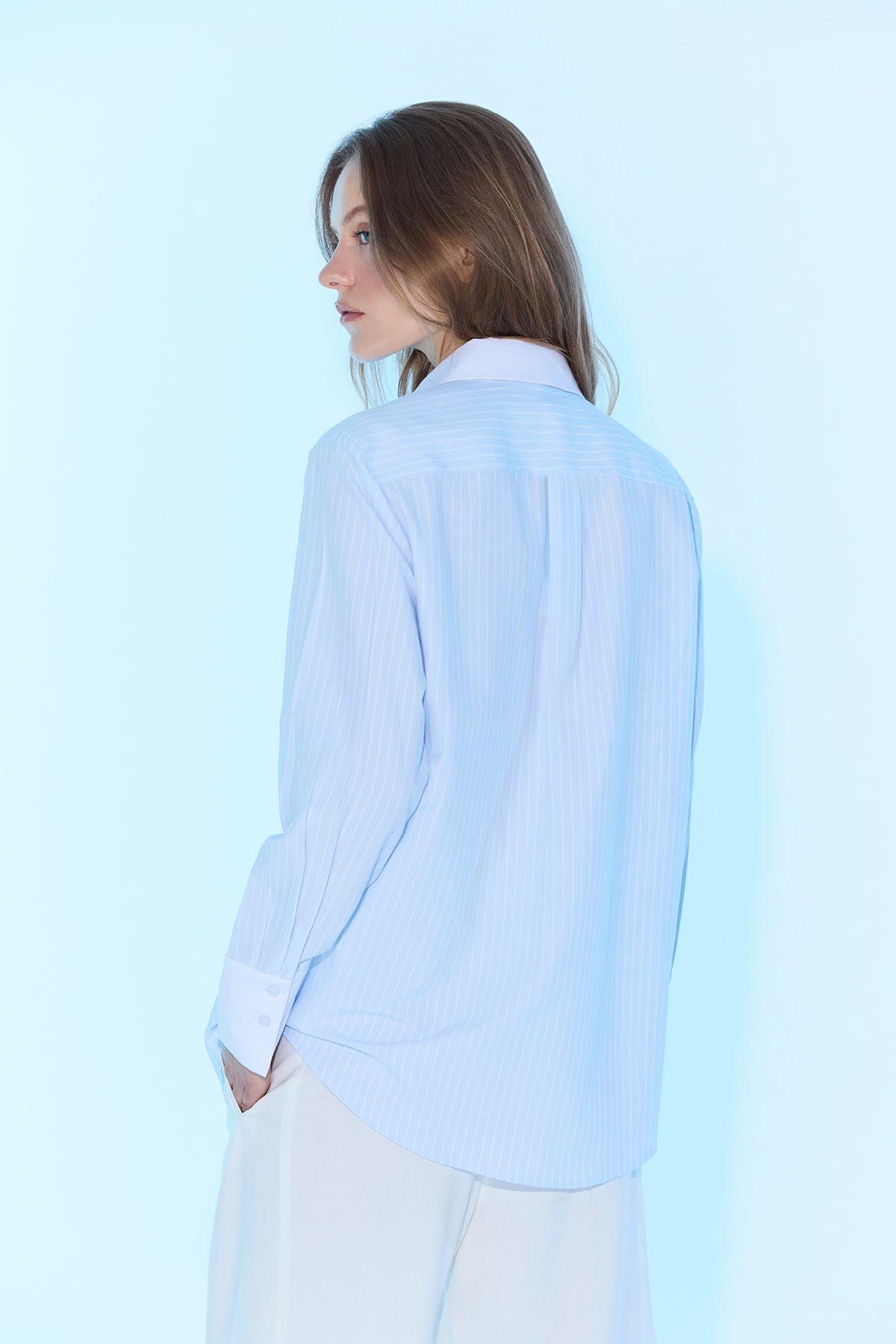AÇIK MAVİ BEYAZ ÇİZGİLİ, BEYAZ YAKA VE MANŞET DETAYLI, OVERSİZE, UZUN KOLLU, CEPLİ GÖMLEK.; MODEL BOYU:1.78 CM MODEL BEDENİ: 34 MODELİN ÖLÇÜLERİ: GÖĞÜS:92 CM BEL: 60 CM BASEN:91 CM DİR.; OMUZDAN BOU:75 CM GÖGÜS:56 CM BEL:35 CM ETEK UCU:55 CM KOL BOYU:62 CM %50 PAMUK % 50POLYESTER