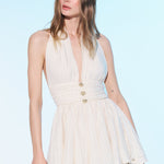 Altın düğme detaylı, mendil etekli, derin V yaka, sırtta gipe lastik detaylı mini elbise.; MODEL BOYU: 1.78 CM MODEL BEDENİ : 34 MODELİN BELİ : 60 CM BASENİ :91 CM DİR .; %98 KOTON %1 METALİZE %1 POLYAMİT