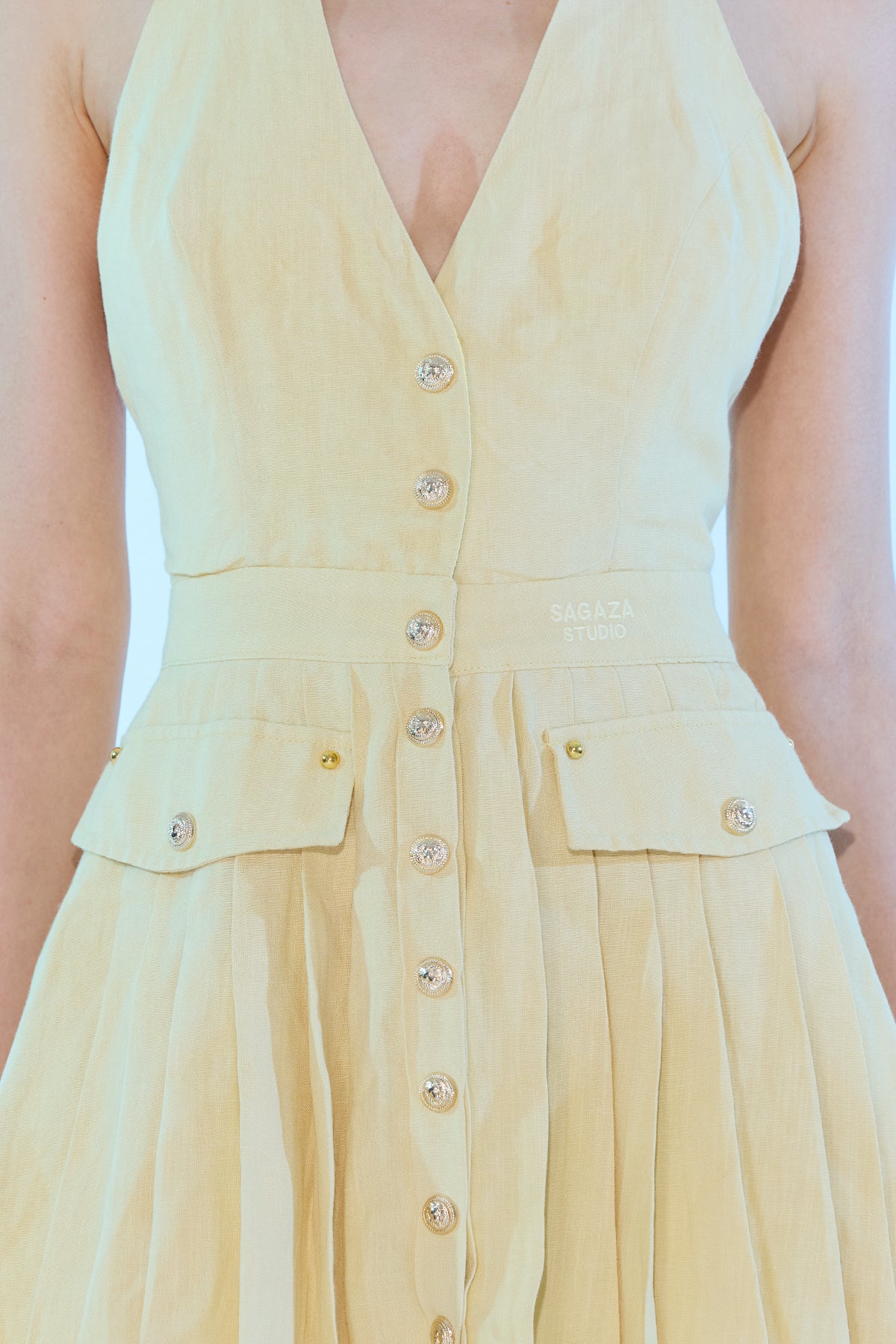 SAGAZA STUDIO BOYUNDAN BAĞLAMALI MINI PİLELİ ELBİSE;%72 VİSKON %28 LİNEN